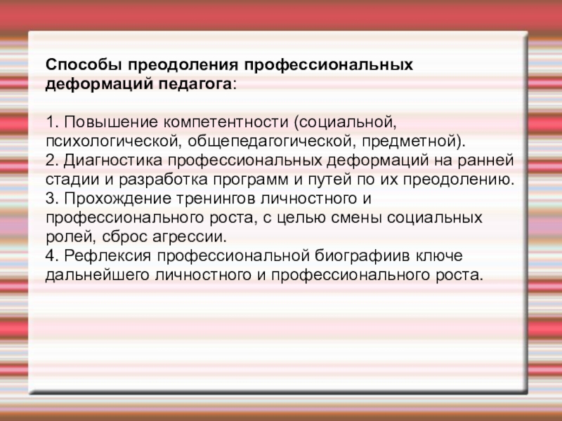 Слайд 28Способы преодоления профессиональных деформаций педагога: