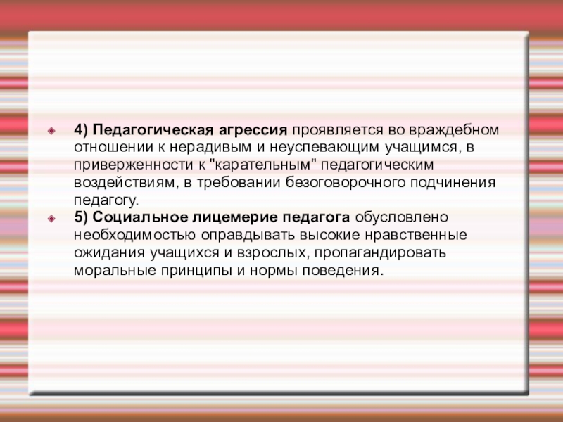 Слайд 144) Педагогическая агрессия проявляется во враждебном отношении к нерадивым и неуспевающим
