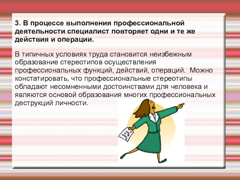 В типичных условиях труда становится неизбежным образование стереотипов осуществления профессиональных функций, действий, операций. Можно констатировать, что профессиональные стереотипы обладают несомненными достоинствами для человека и являются основой образования многих профессиональных деструкций личности.