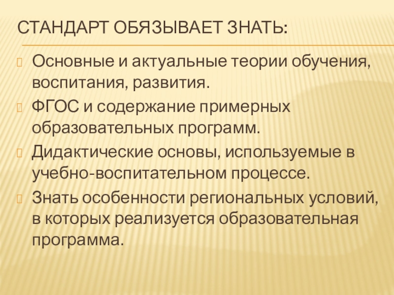 Стандарт обязывает знать: Основные и актуальные теории обучения, воспитания, развития.ФГОС и содержание примерных образовательных программ.Дидактические основы, используемые