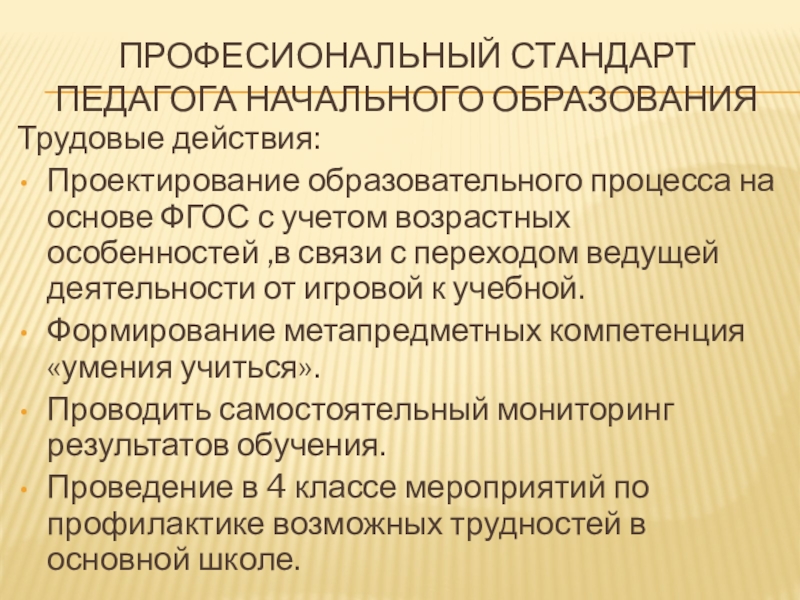 Професиональный стандарт педагога начального образованияТрудовые действия:Проектирование образовательного процесса на основе ФГОС с учетом возрастных особенностей ,в связи