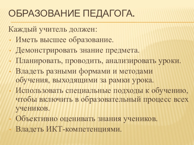 Образование педагога.Каждый учитель должен:Иметь высшее образование.Демонстрировать знание предмета.Планировать, проводить, анализировать уроки.Владеть разными формами и методами обучения, выходящими