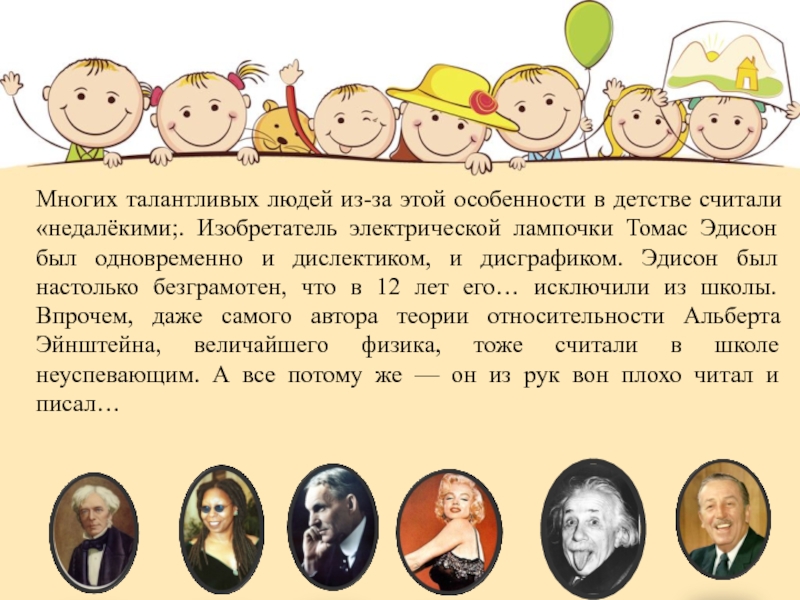 электрической лампочки Томас Эдисон был одновременно и дислектиком, и дисграфиком. Эдисон был настолько безграмотен, что в 12 лет его… исключили из школы. Впрочем, даже самого автора теории относительности Альберта Эйнштейна, величайшего физика, тоже считали в школе неуспевающим. А все потому же — он из рук вон плохо читал и писал…