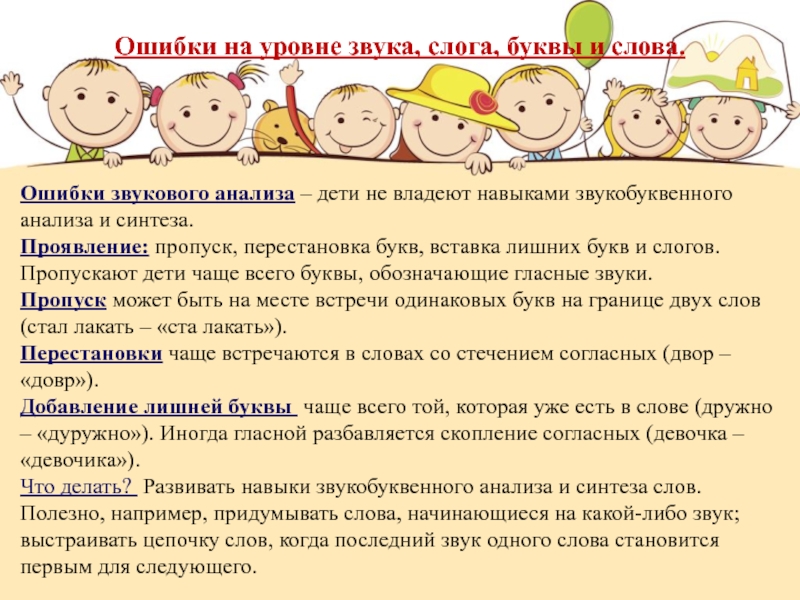 Слайд 7Ошибки на уровне звука, слога, буквы и слова.