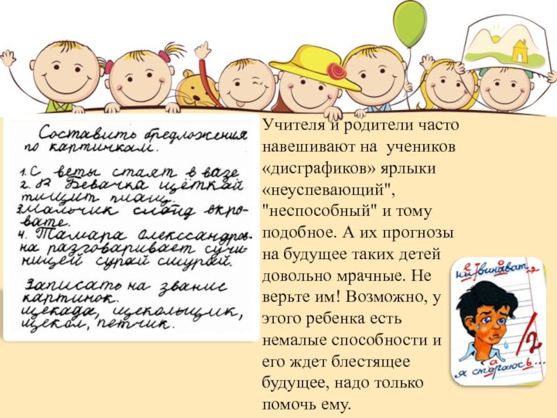Слайд 2Учителя и родители часто навешивают на учеников «дисграфиков» ярлыки «неуспевающий", "неспособный"
