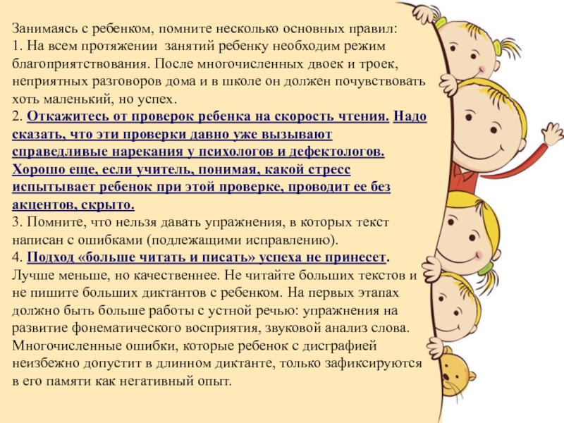 Конечно же, ошибки, имеющие логопедическую природу, должен предупреждать и корректировать специалист. Но будем реалистами: логопед есть далеко не в каждой школе. Поэтому я Вам предлагаю ряд рекомендаций по работе с детьми – дисграфиками и дислексиками для учителей и родителей.