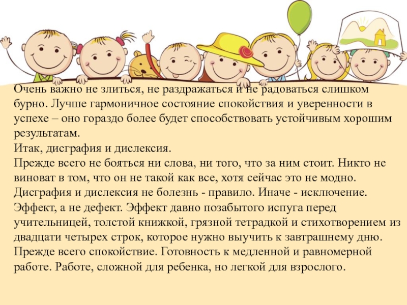 Прежде всего не бояться ни слова, ни того, что за ним стоит. Никто не виноват в том, что он не такой как все, хотя сейчас это не модно. Дисграфия и дислексия не болезнь - правило. Иначе - исключение. Эффект, а не дефект. Эффект давно позабытого испуга перед учительницей, толстой книжкой, грязной тетрадкой и стихотворением из двадцати четырех строк, которое нужно выучить к завтрашнему дню. Прежде всего спокойствие. Готовность к медленной и равномерной работе. Работе, сложной для ребенка, но легкой для взрослого.