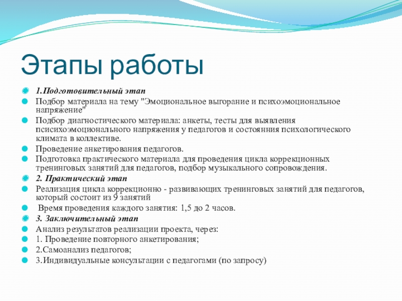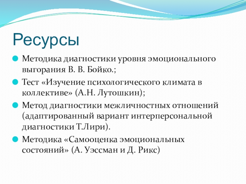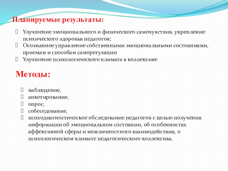 психодиагностическое обследование педагогов с целью получения информации об эмоциональном состоянии, об особенностях аффективной сферы и межличностного взаимодействия, о психологическом климате педагогического коллектива.
