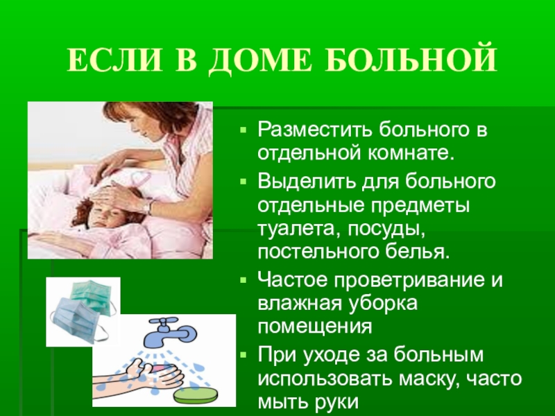 ЕСЛИ В ДОМЕ БОЛЬНОЙРазместить больного в отдельной комнате.Выделить для больного отдельные предметы туалета, посуды, постельного белья.Частое проветривание