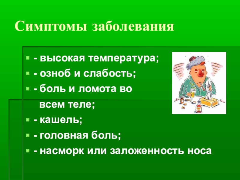 Симптомы заболевания- высокая температура;- озноб и слабость; - боль и ломота во   всем теле;- кашель;-