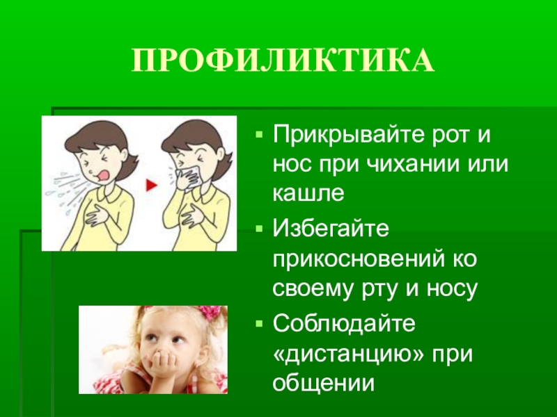 ПРОФИЛИКТИКАПрикрывайте рот и нос при чихании или кашлеИзбегайте прикосновений ко своему рту и носуСоблюдайте «дистанцию» при общении