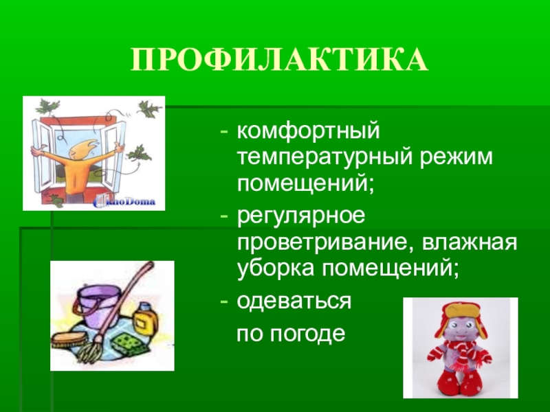 ПРОФИЛАКТИКАкомфортный температурный режим помещений;регулярное проветривание, влажная уборка помещений;одеваться  по погоде