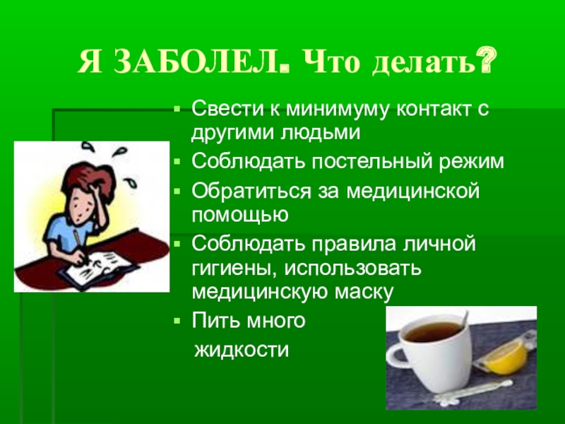 Я ЗАБОЛЕЛ. Что делать?Свести к минимуму контакт с другими людьмиСоблюдать постельный режимОбратиться за медицинской помощьюСоблюдать правила личной