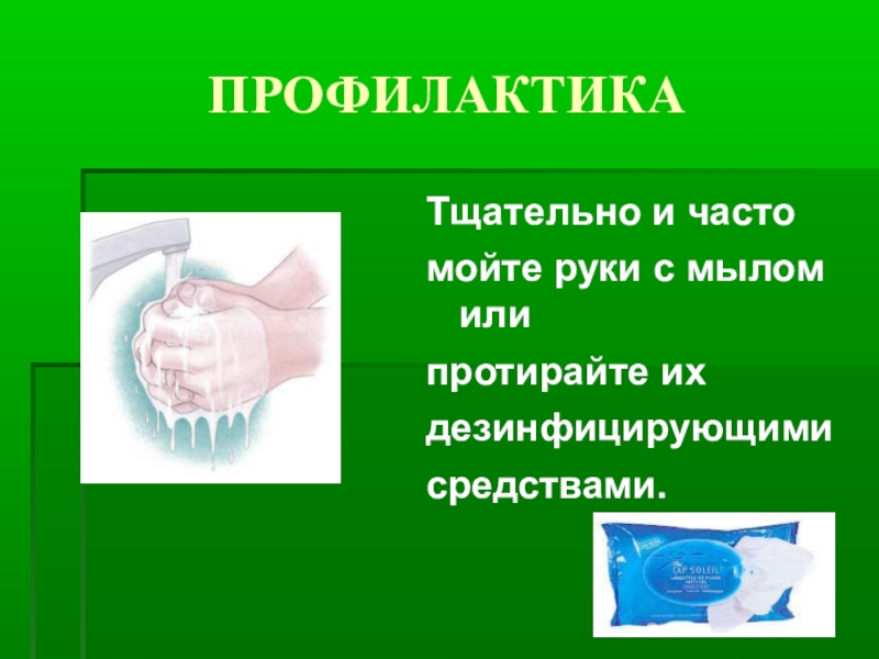 ПРОФИЛАКТИКАТщательно и частомойте руки с мылом     илипротирайте ихдезинфицирующимисредствами.