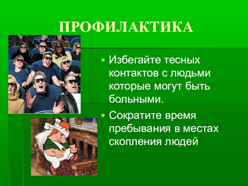 ПРОФИЛАКТИКАИзбегайте тесных контактов с людьми которые могут быть больными.Сократите время пребывания в местах скопления людей