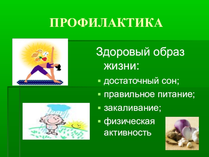 ПРОФИЛАКТИКАЗдоровый образ жизни:достаточный сон;правильное питание;закаливание;физическая активность