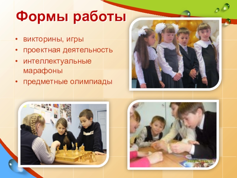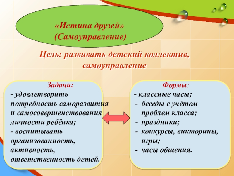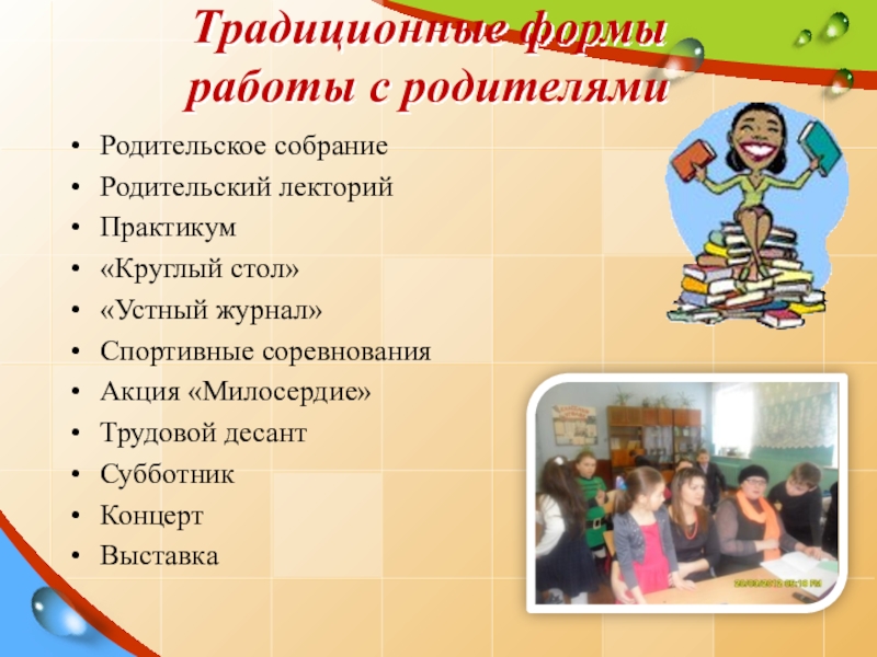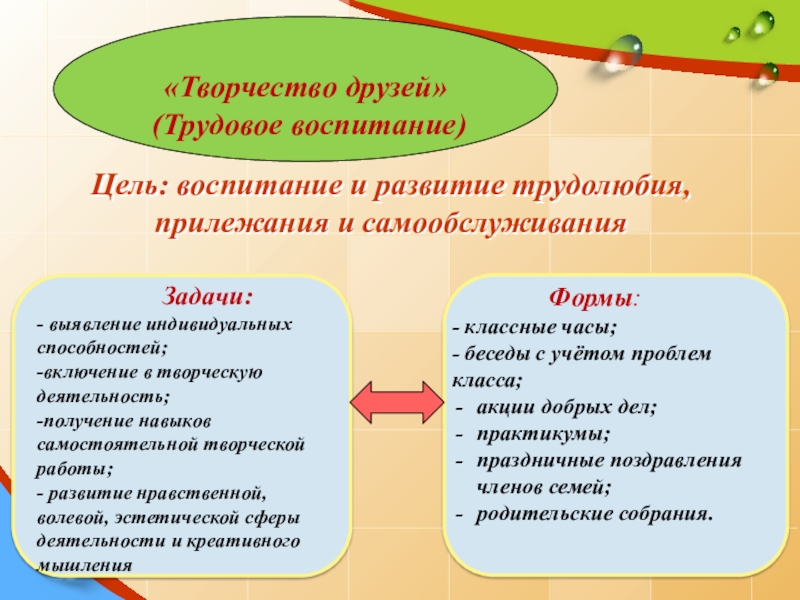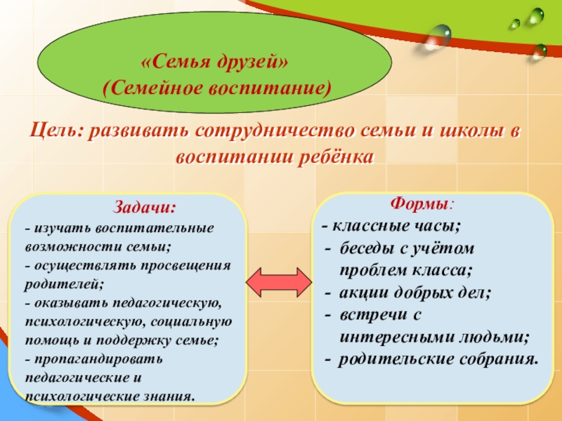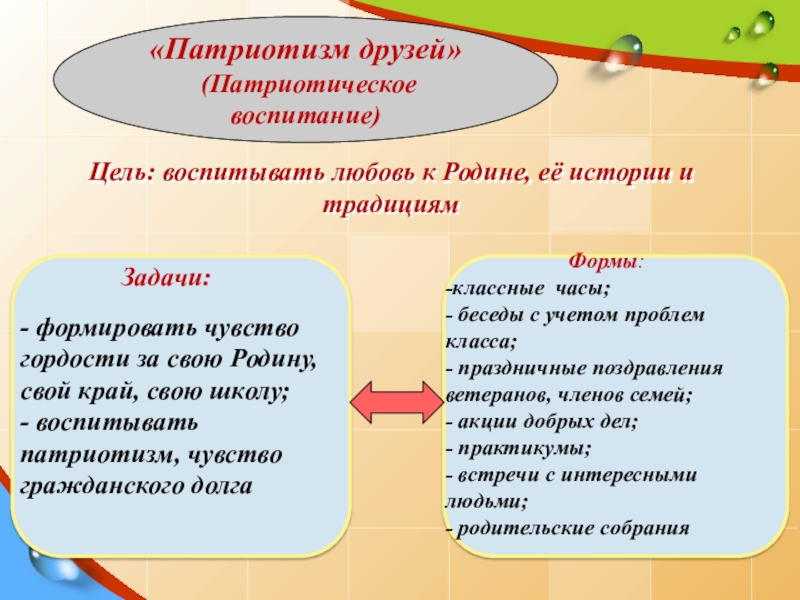 Формы: -классные часы; - беседы с учетом проблем класса; - праздничные поздравления ветеранов, членов семей; - акции добрых дел; - практикумы; - встречи с интересными людьми;