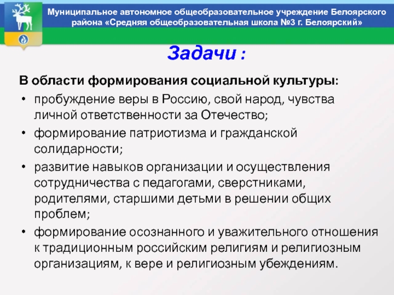 формирование осознанного и уважительного отношения к традиционным российским религиям и религиозным организациям, к вере и религиозным убеждениям.