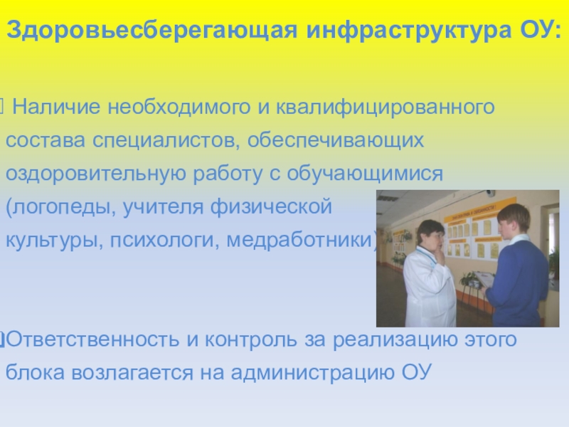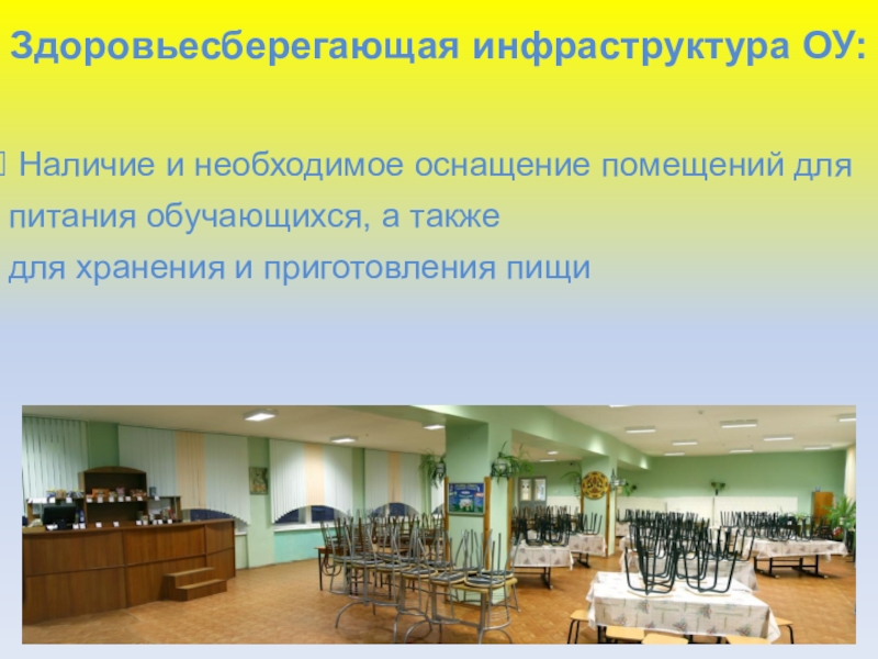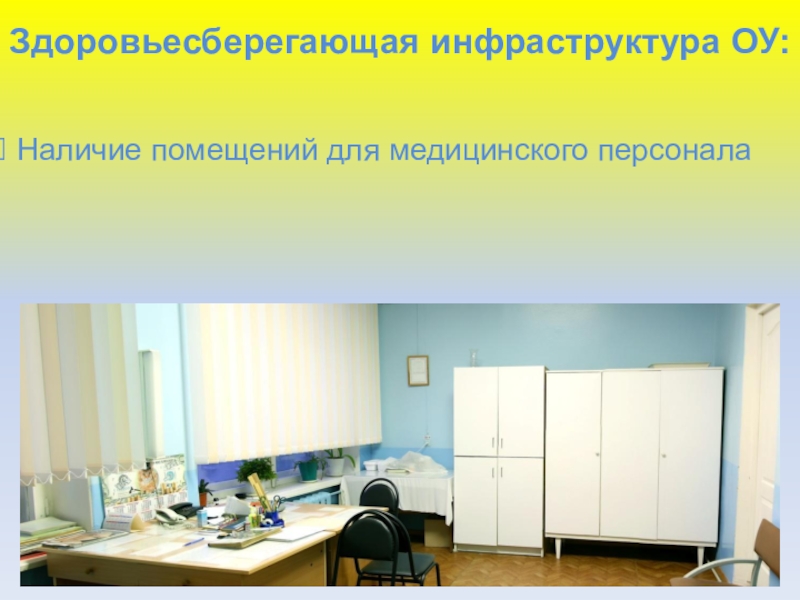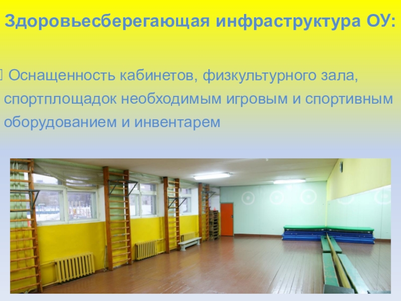 Слайд 9Здоровьесберегающая инфраструктура ОУ: