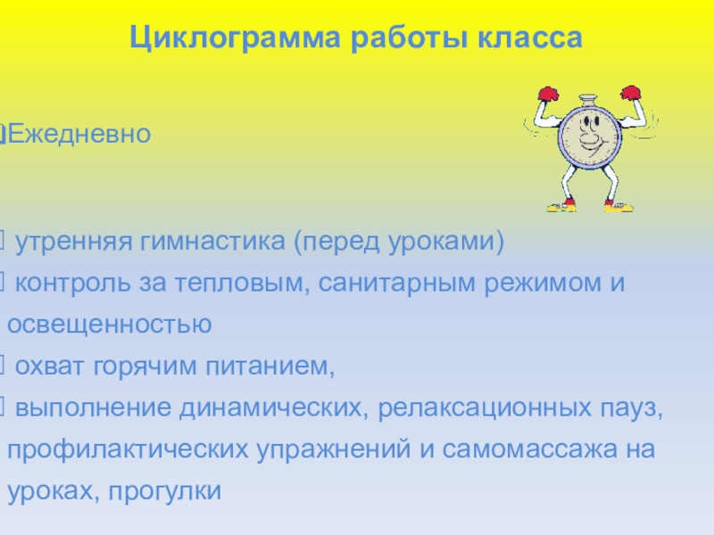 выполнение динамических, релаксационных пауз, профилактических упражнений и самомассажа на уроках, прогулки