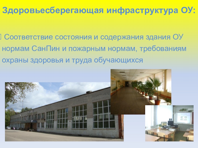 Слайд 7Здоровьесберегающая инфраструктура ОУ: