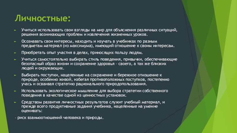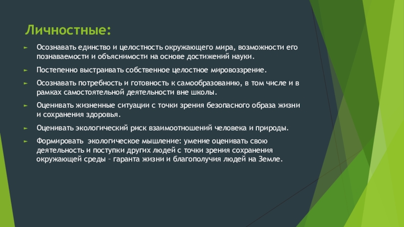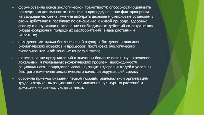 Слайд 15формирование основ экологической грамотности: способности оценивать последствия деятельности человека в природе,