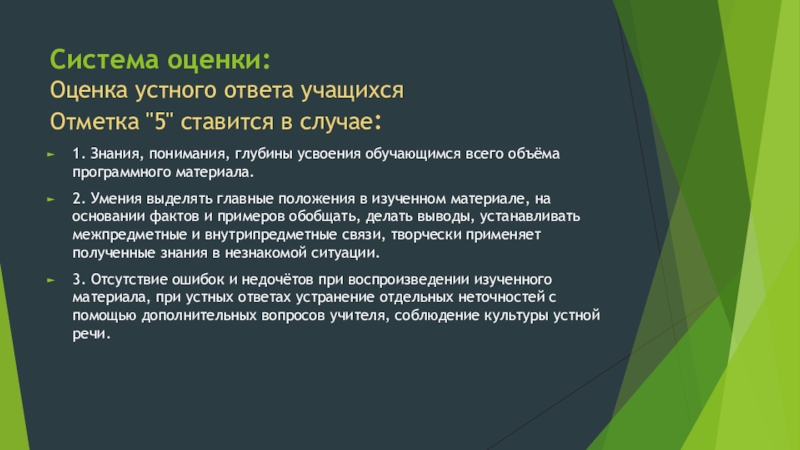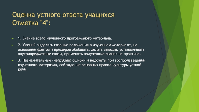 3. Отсутствие ошибок и недочётов при воспроизведении изученного материала, при устных ответах устранение отдельных неточностей с помощью дополнительных вопросов учителя, соблюдение культуры устной речи.