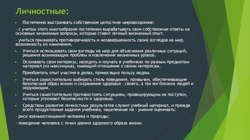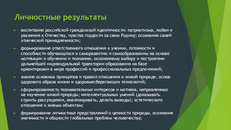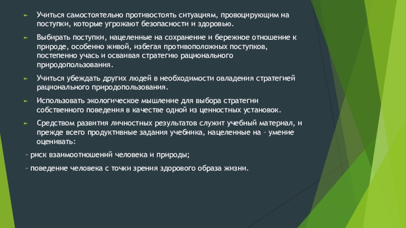 влияние факторов риска на здоровье человека; умение выбирать целевые и смысловые установки в своих действиях и поступках по отношению к живой природе, здоровью своему и окружающих; осознание необходимости действий по сохранению биоразнообразия и природных местообитаний, видов растений и животных;