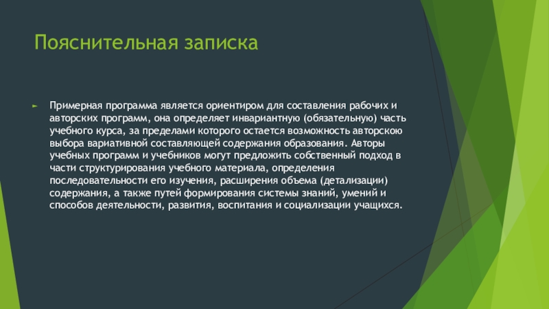 она определяет инвариантную (обязательную) часть учебного курса, за пределами которого остается возможность авторскою выбора вариативной составляющей содержания образования. Авторы учебных программ и учебников могут предложить собственный подход в части структурирования учебного материала, определения последовательности его изучения, расширения объема (детализации) содержания, а также путей формирования системы знаний, умений и способов деятельности, развития, воспитания и социализации учащихся.