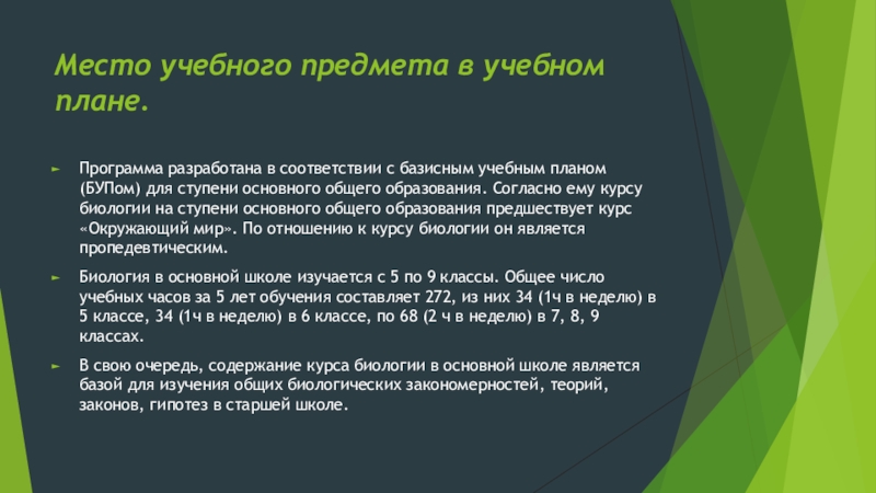 учебным планом (БУПом) для ступени основного общего образования. Согласно ему курсу биологии на ступени основного общего образования предшествует курс «Окружающий мир». По отношению к курсу биологии он является пропедевтическим.