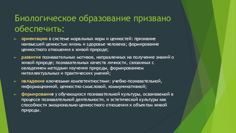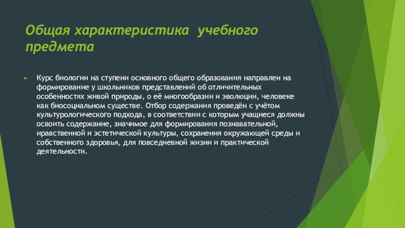 на формирование у школьников представлений об отличительных особенностях живой природы, о её многообразии и эволюции, человеке как биосоциальном существе. Отбор содержания проведён с учётом культурологического подхода, в соответствии с которым учащиеся должны освоить содержание, значимое для формирования познавательной, нравственной и эстетической культуры, сохранения окружающей среды и собственного здоровья, для повседневной жизни и практической деятельности.