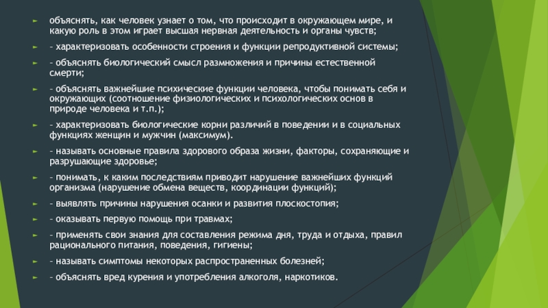 – объяснять основные физиологические функции человека и биологический смысл их регуляции;
