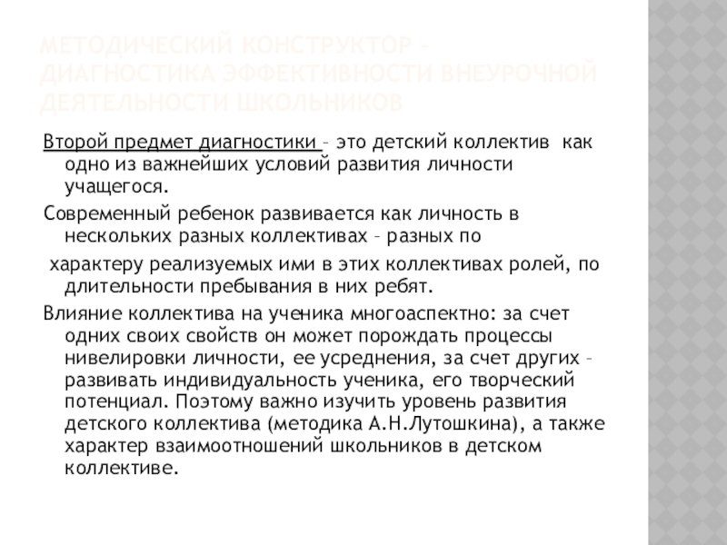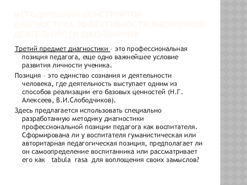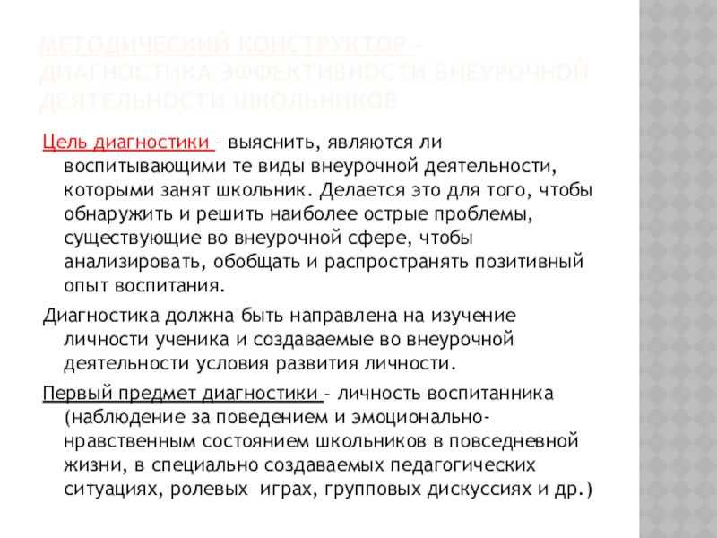 Слайд 9МЕТОДИЧЕСКИЙ КОНСТРУКТОР – ДИАГНОСТИКА ЭФФЕКТИВНОСТИ ВНЕУРОЧНОЙ ДЕЯТЕЛЬНОСТИ ШКОЛЬНИКОВ