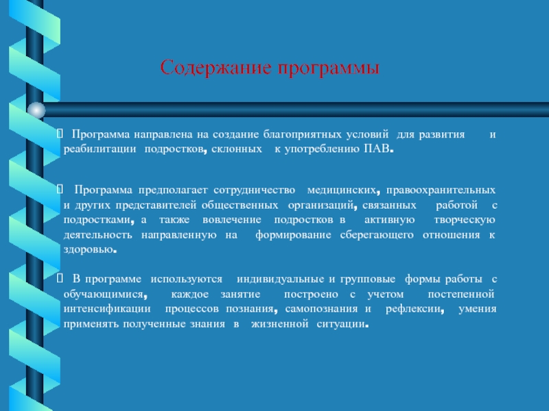 Программа направлена на создание благоприятных условий для развития и реабилитации подростков, склонных к употреблению ПАВ.