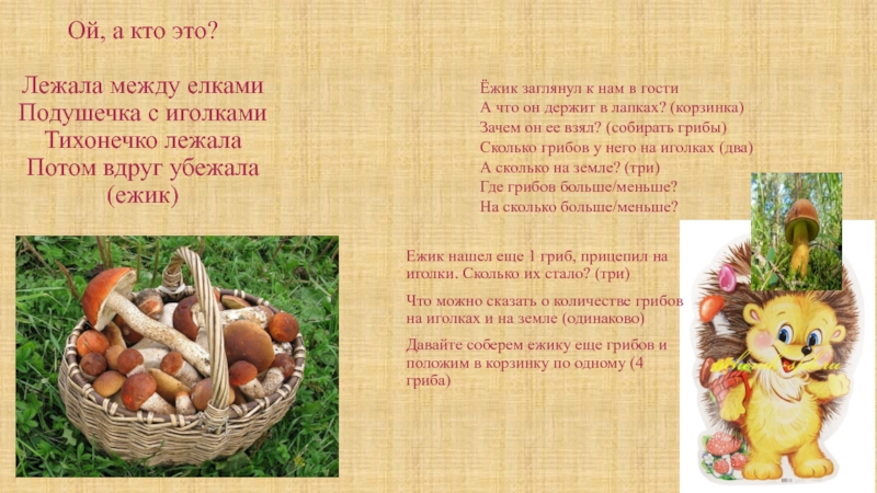 Давайте соберем ежику еще грибов и положим в корзинку по одному (4 гриба)