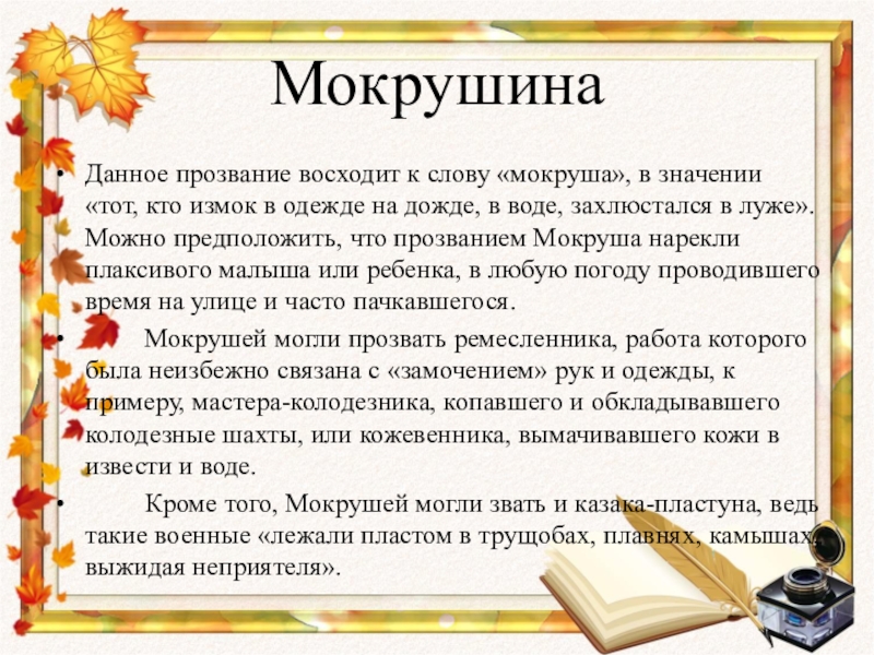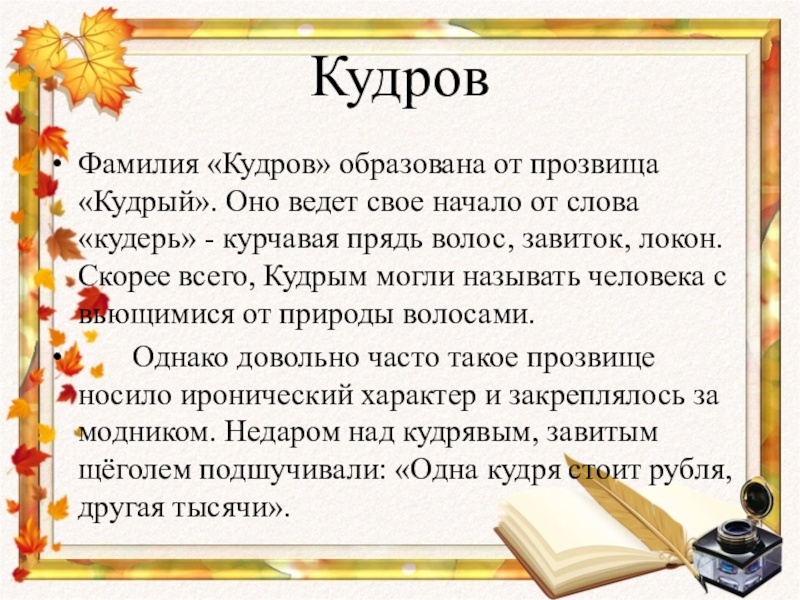 Подробный анализ русских фамилий, включая происхождение и частотность употребления, можно найти в книге Б. О. Унбегауна «Русские фамилии».