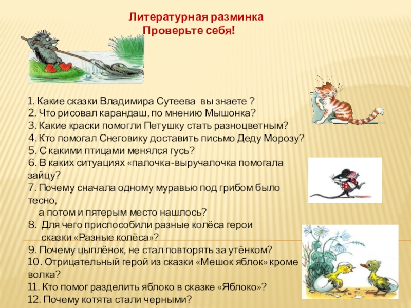 Литературная разминка    Проверьте себя!1. Какие сказки Владимира Сутеева вы знаете ?2. Что рисовал карандаш,