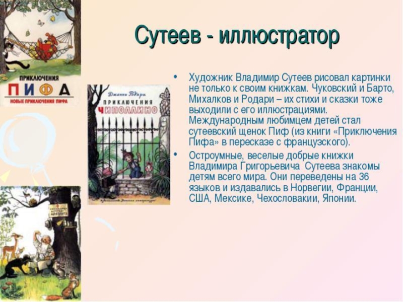 писать для детей. Сначала он создавал мультфильмы, работая художником-мультипликатором. Но в один прекрасный день решил попробовать себя в литературе. Результатом этого решения стало множество удивительных добрых сказок Сутеева для детей, иллюстрированных рисунками самого автора.