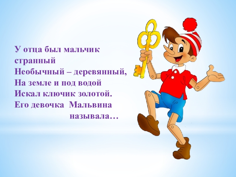 У отца был мальчик странныйНеобычный – деревянный,На земле и под водойИскал ключик золотой.Его девочка Мальвина