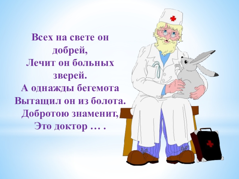 Всех на свете он добрей,Лечит он больных зверей.А однажды бегемотаВытащил он из болота.Добротою знаменит,Это доктор … .