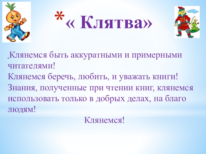 « Клятва» Клянемся быть аккуратными и примерными читателями!Клянемся беречь, любить, и уважать книги!Знания, полученные при чтении книг,