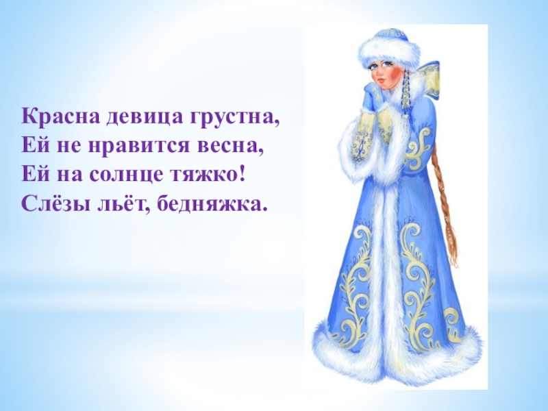 Красна девица грустна,Ей не нравится весна,Ей на солнце тяжко!Слёзы льёт, бедняжка.