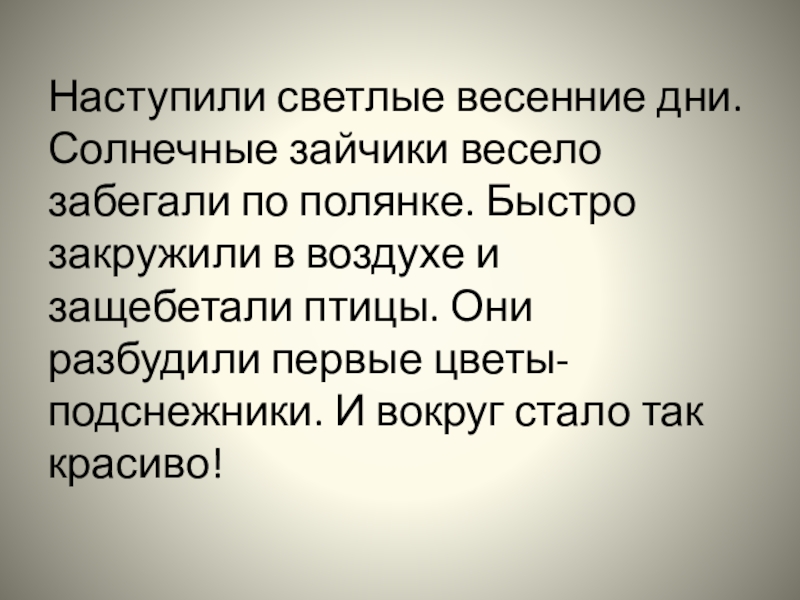 Слайд 8Наступили светлые весенние дни. Солнечные зайчики весело забегали по полянке. Быстро закружили