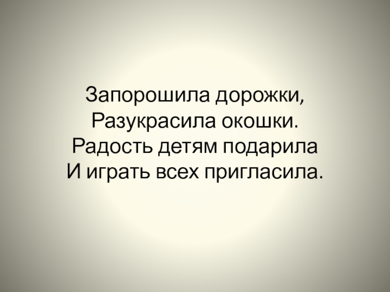 Слайд 3 Запорошила дорожки, Разукрасила окошки. Радость детям подарила И играть всех пригласила.