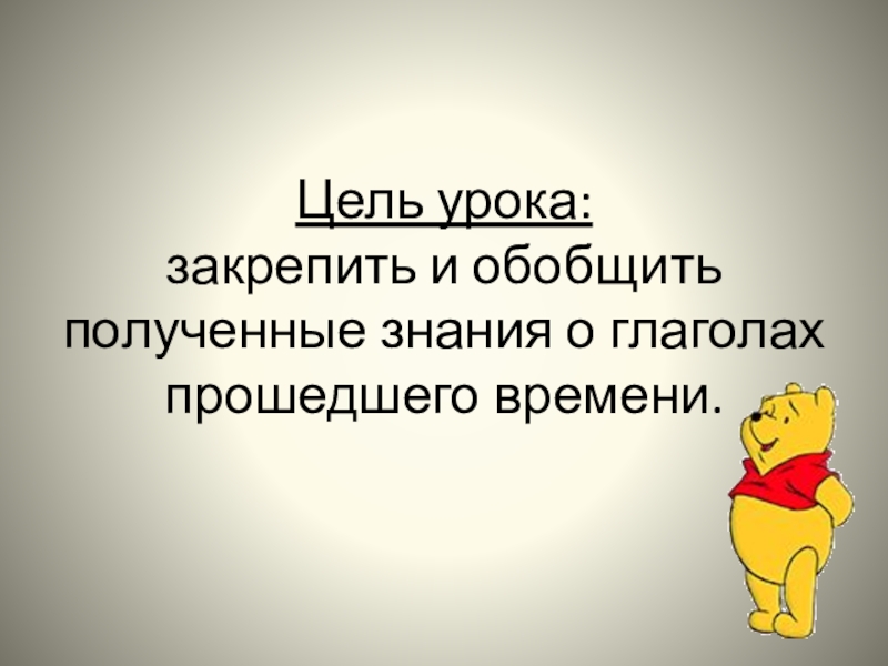 Слайд 6 Цель урока: закрепить и обобщить полученные знания о глаголах прошедшего времени.