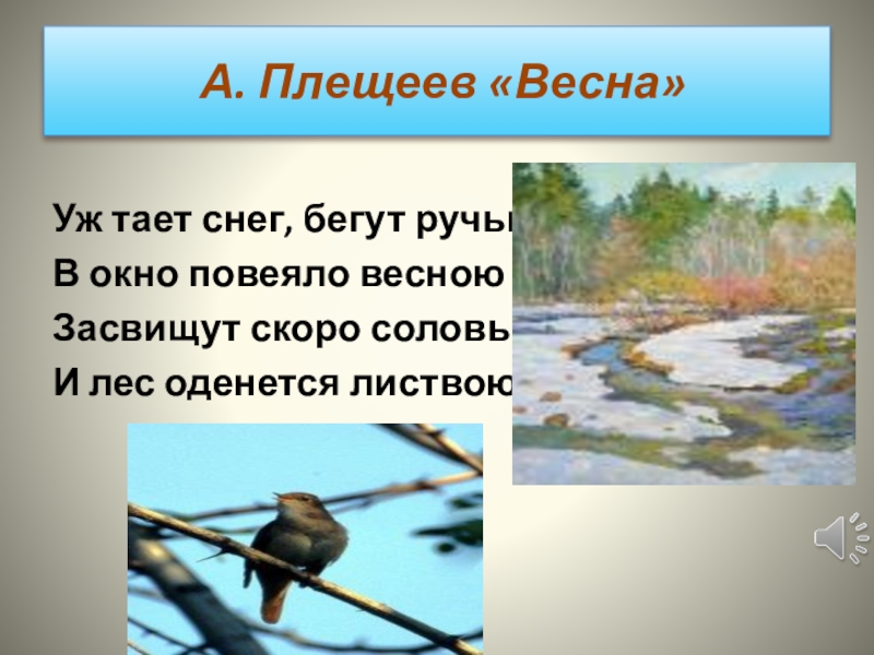 А. Плещеев «Весна» 	  	    Уж тает снег, бегут ручьи,В окно повеяло