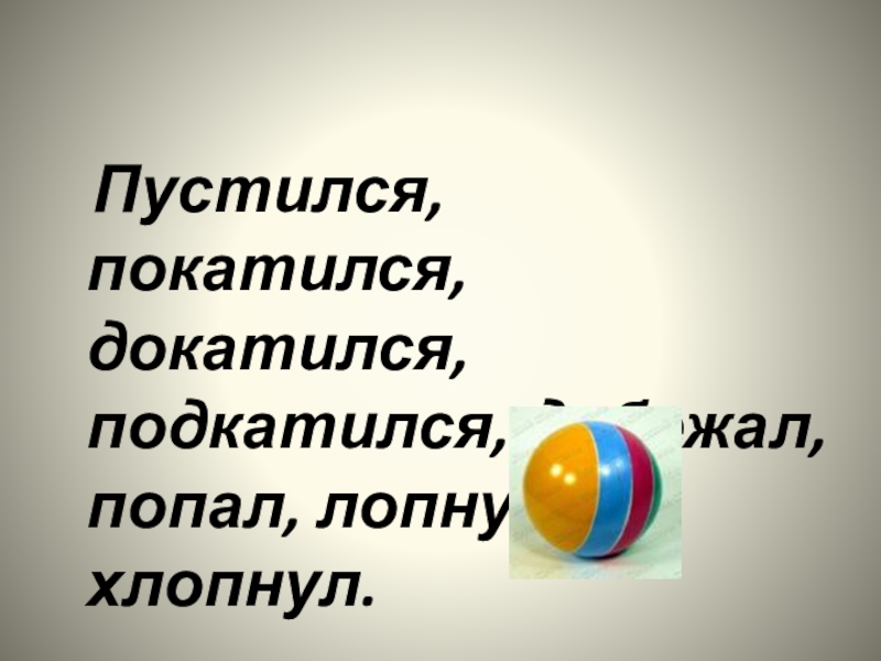 Слайд 10 Пустился, покатился, докатился, подкатился, добежал, попал, лопнул, хлопнул.
