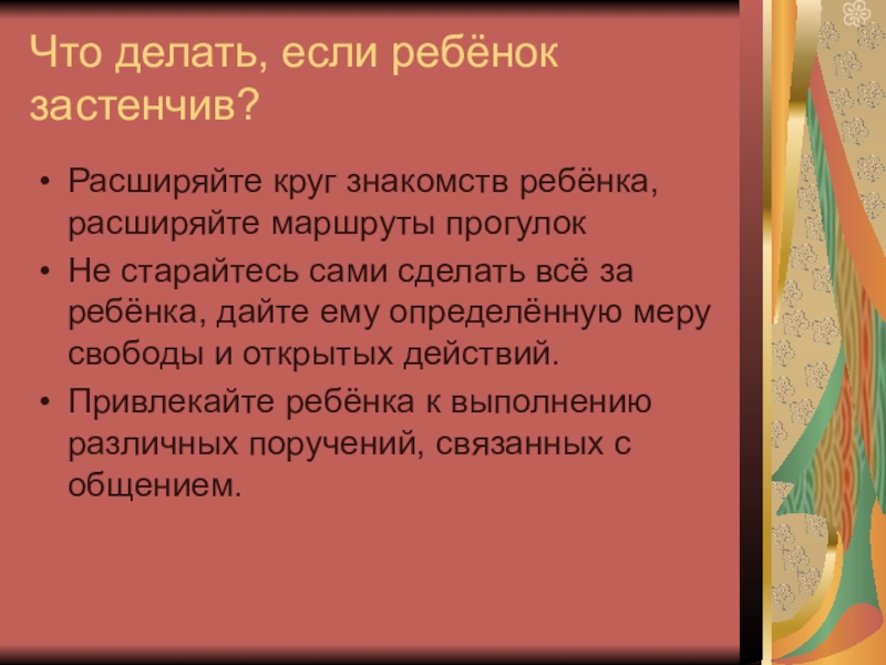 Что делать, если ребёнок застенчив?Расширяйте круг знакомств ребёнка, расширяйте маршруты прогулокНе старайтесь сами сделать всё за ребёнка, дайте ему определённую меру свободы и открытых действий.Привлекайте ребёнка к выполнению различных поручений, связанных с общением.