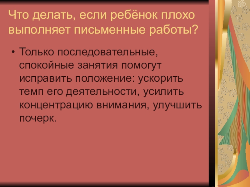 Слайд 5Что делать, если ребёнок плохо выполняет письменные работы?