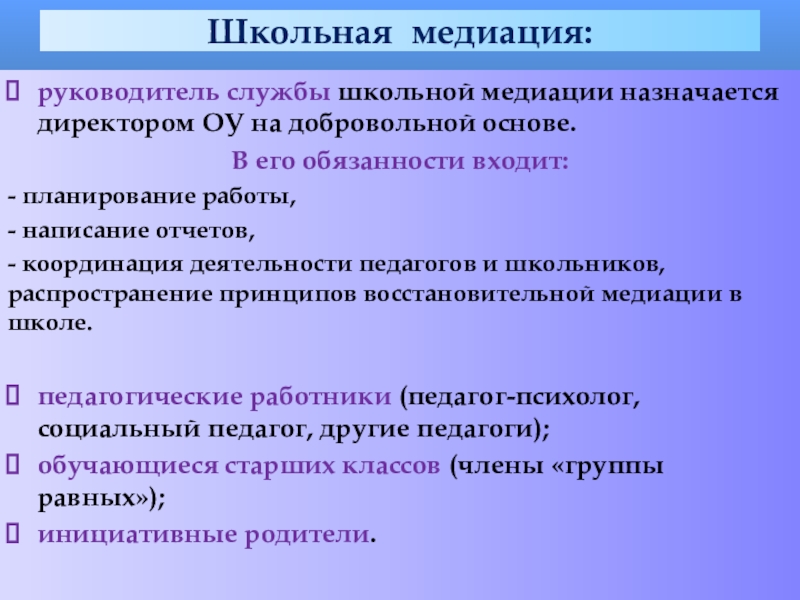 руководитель службы школьной медиации назначается директором ОУ на добровольной основе.